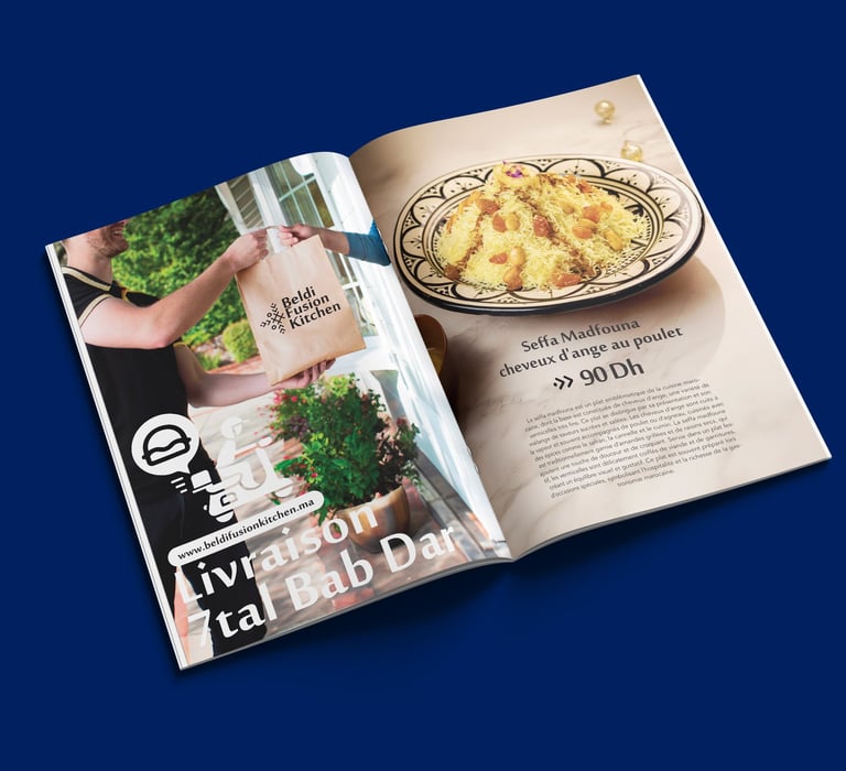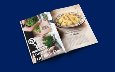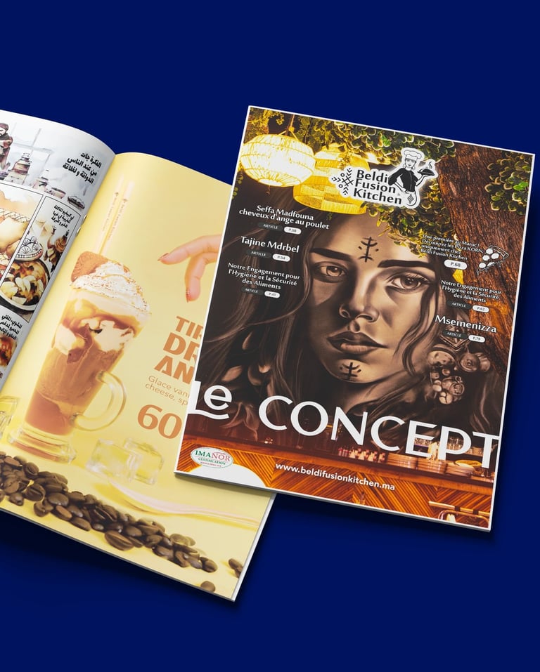 BFK Magazine was a truly special project for me. The challenge was to merge a restaurant menu with the spirit of a magazine and make it as original as possible. I’m proud to say I succeeded—creating what I consider the most unique restaurant menu in Morocco. Each page invites you to dive in, discover, and observe every detail. Designing it was both an honor and a joy.
